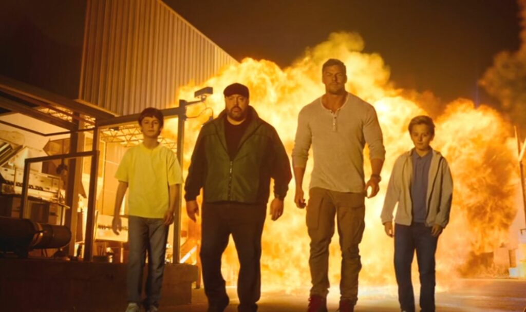 Ritchson joue sur le contraste. Son physique d’action hero est constamment mis en tension avec les situations domestiques les plus triviales. Il prépare des goûters, parle d’éducation bienveillante, tout en laissant planer une menace latente. Le film tire une partie de son humour de cette dissonance permanente.